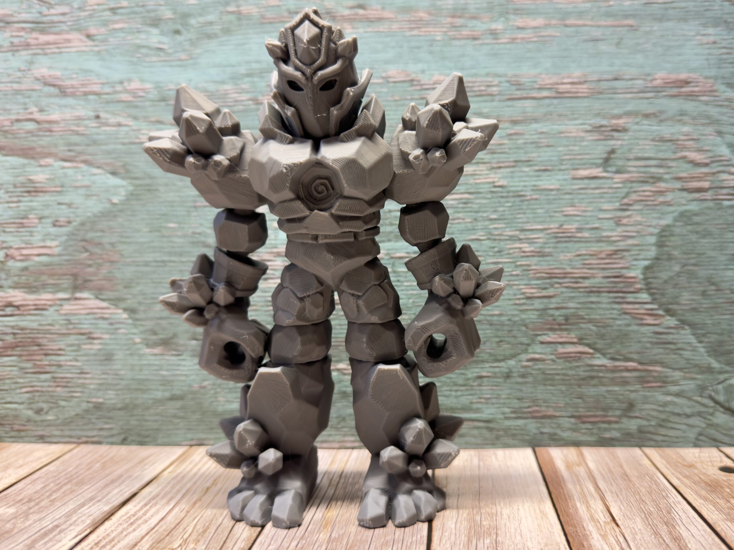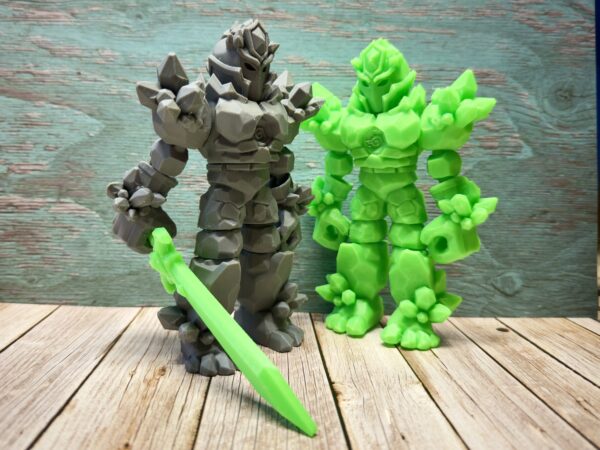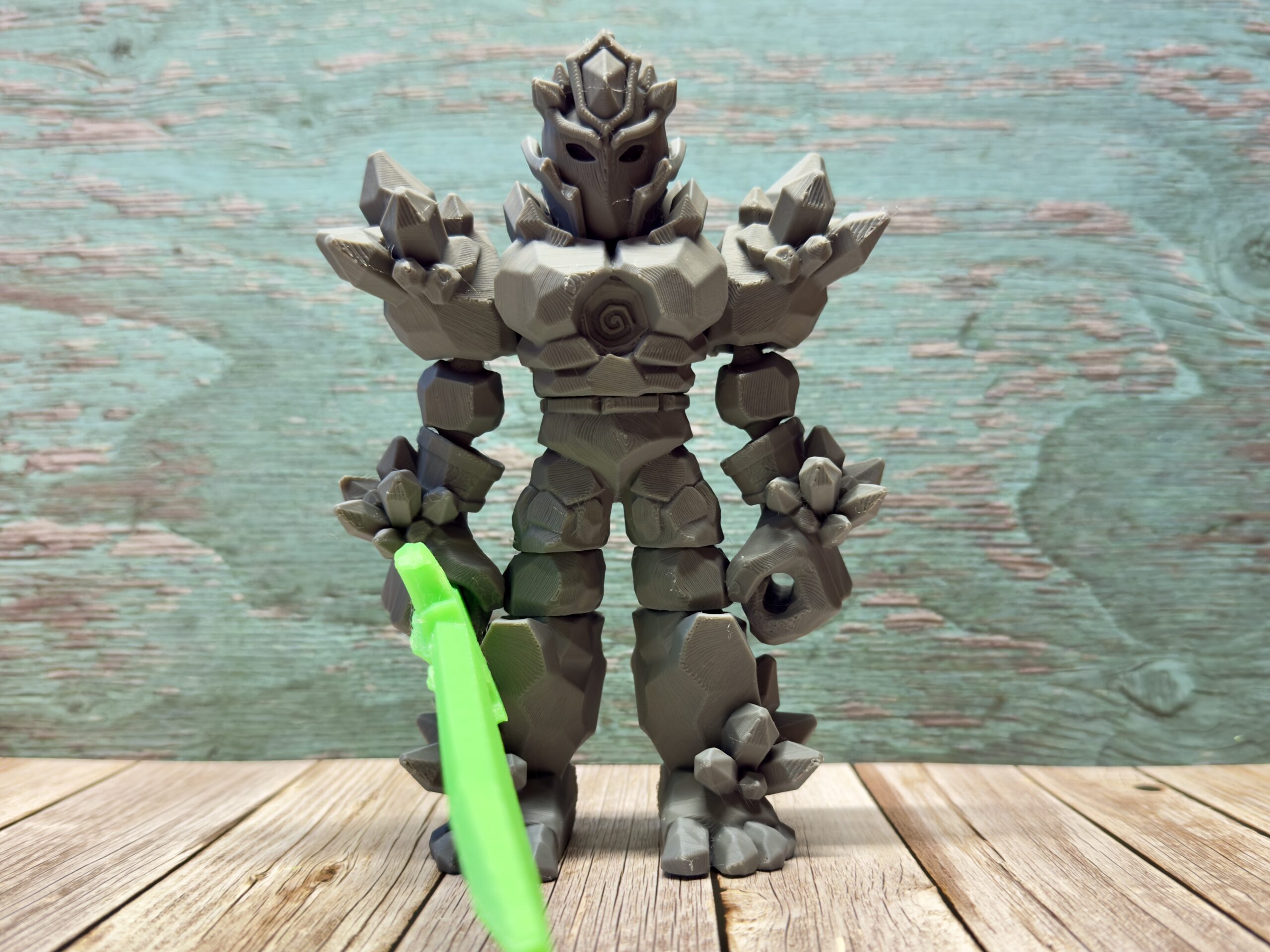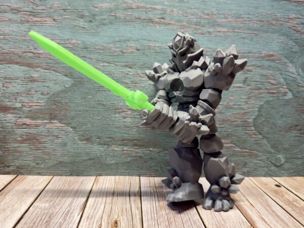 This commanding figure features a fully articulated body with moving head, arms, legs, and tail, allowing for countless heroic poses. The intricate crystal-spiked armour covers massive shoulders, a detailed chest plate with spiral emblem, and powerful limbs. The striking helmet design with pointed crest and face guard gives this knight an imposing presence. Crystal formations emerge from the shoulders and back, suggesting earth elemental power. The robust build and digitigrade legs (dinosaur-style) provide stable standing positions. Complete with a vibrant translucent energy sword that fits perfectly in the articulated hand!