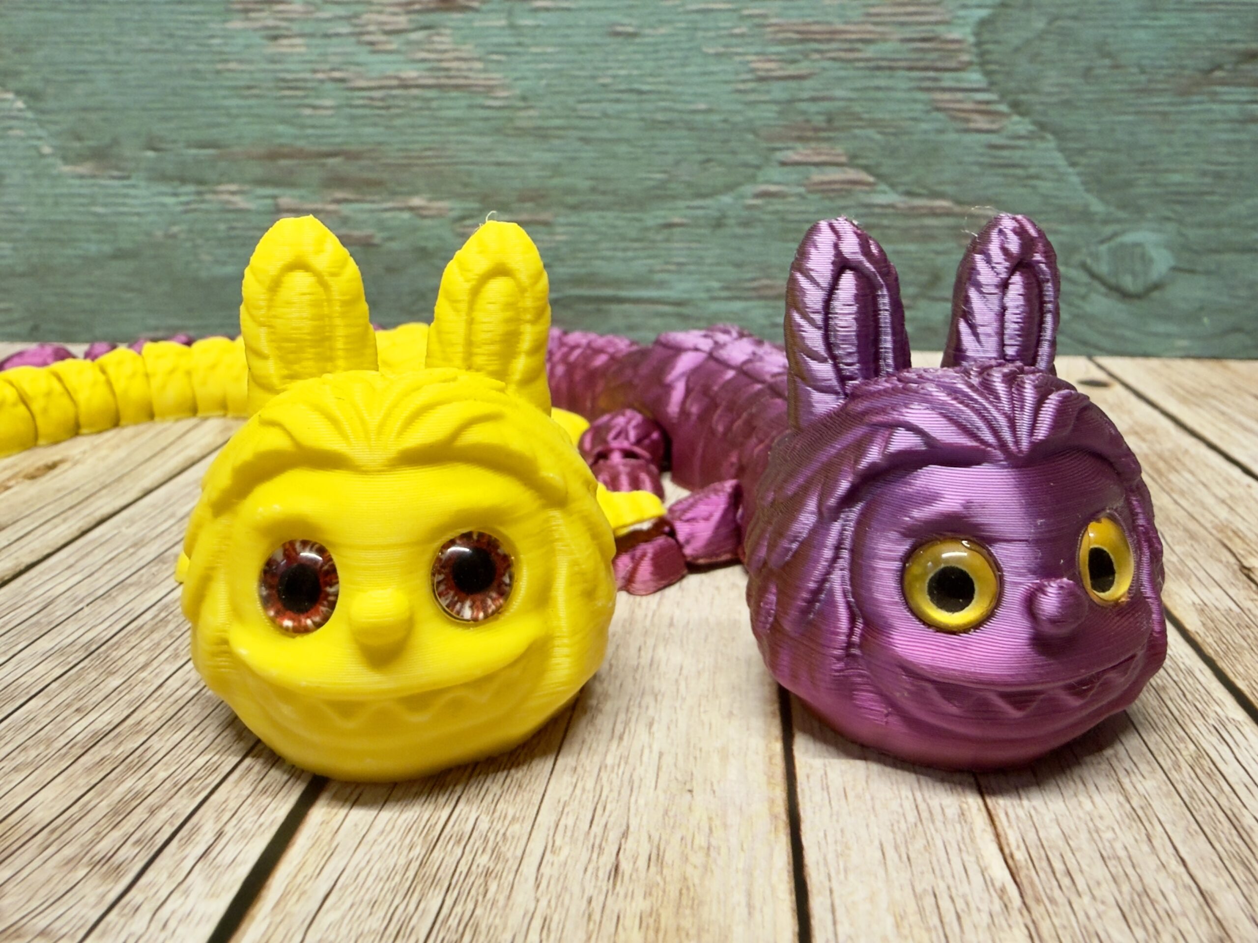 Meet Longbubu, the cutest snake you’ll ever befriend! With enormous expressive eyes, bunny-like ears, and a wonderfully long articulated body, this charming serpent brings quirky personality to any collection.