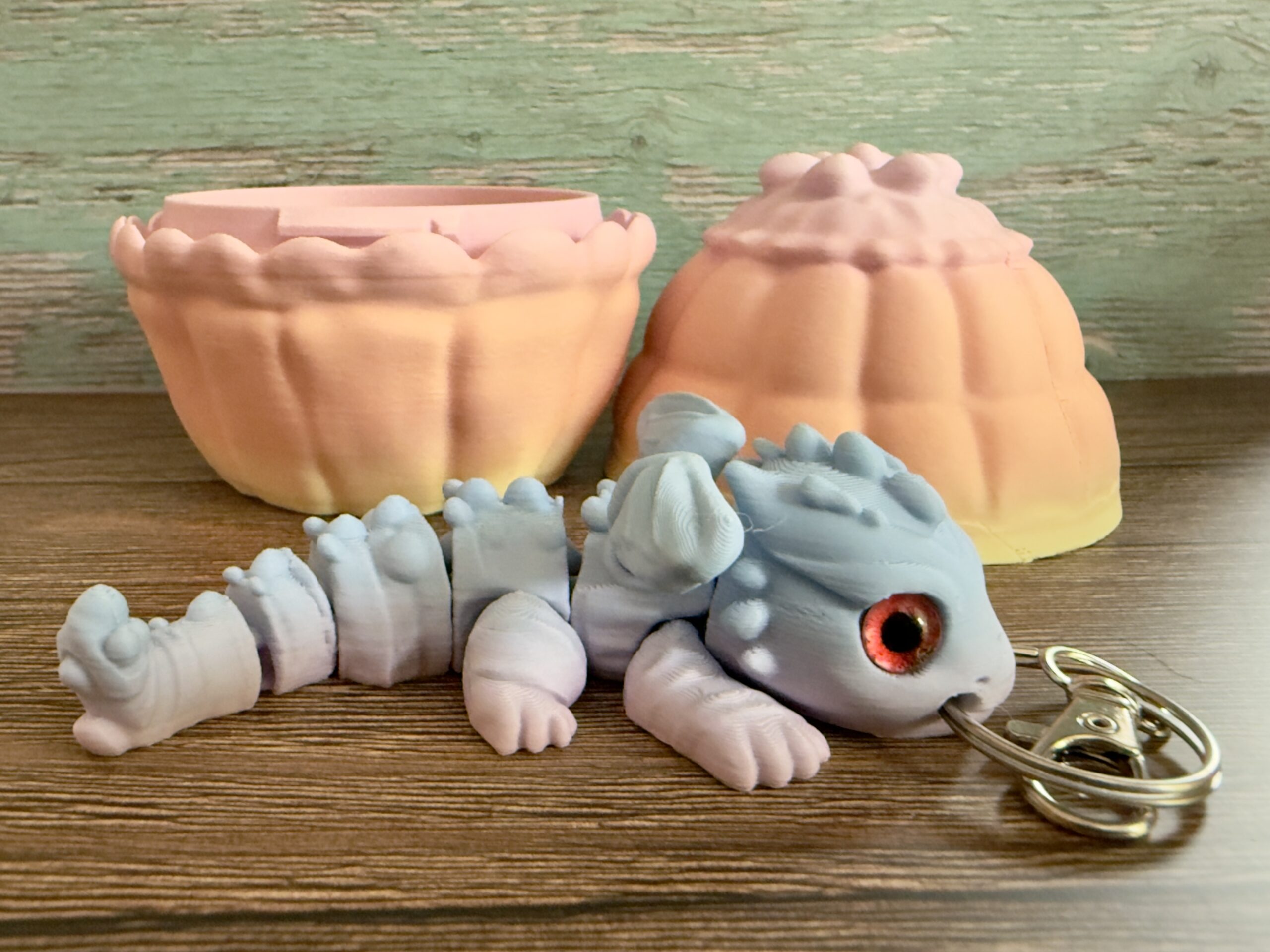 The egg features gorgeous shell-textured detailing with a smooth gradient finish that splits perfectly in half to showcase your tiny dragon companion. The baby dragon keyring boasts striking glass eyes, intricate scaled body segments, cute little claws, and miniature wings – all attached to a sturdy keyring ready for your keys or bag.