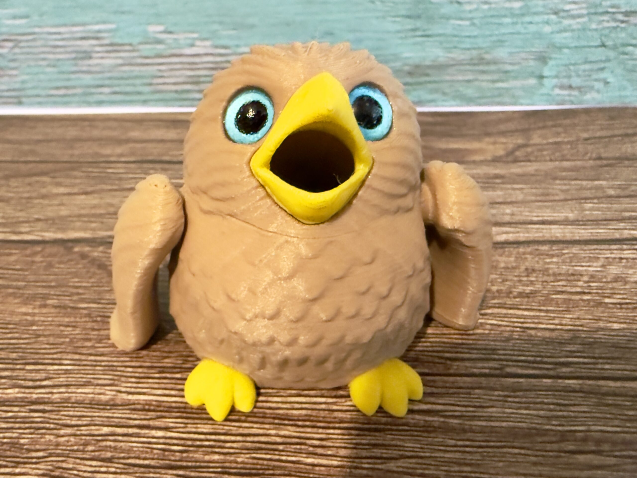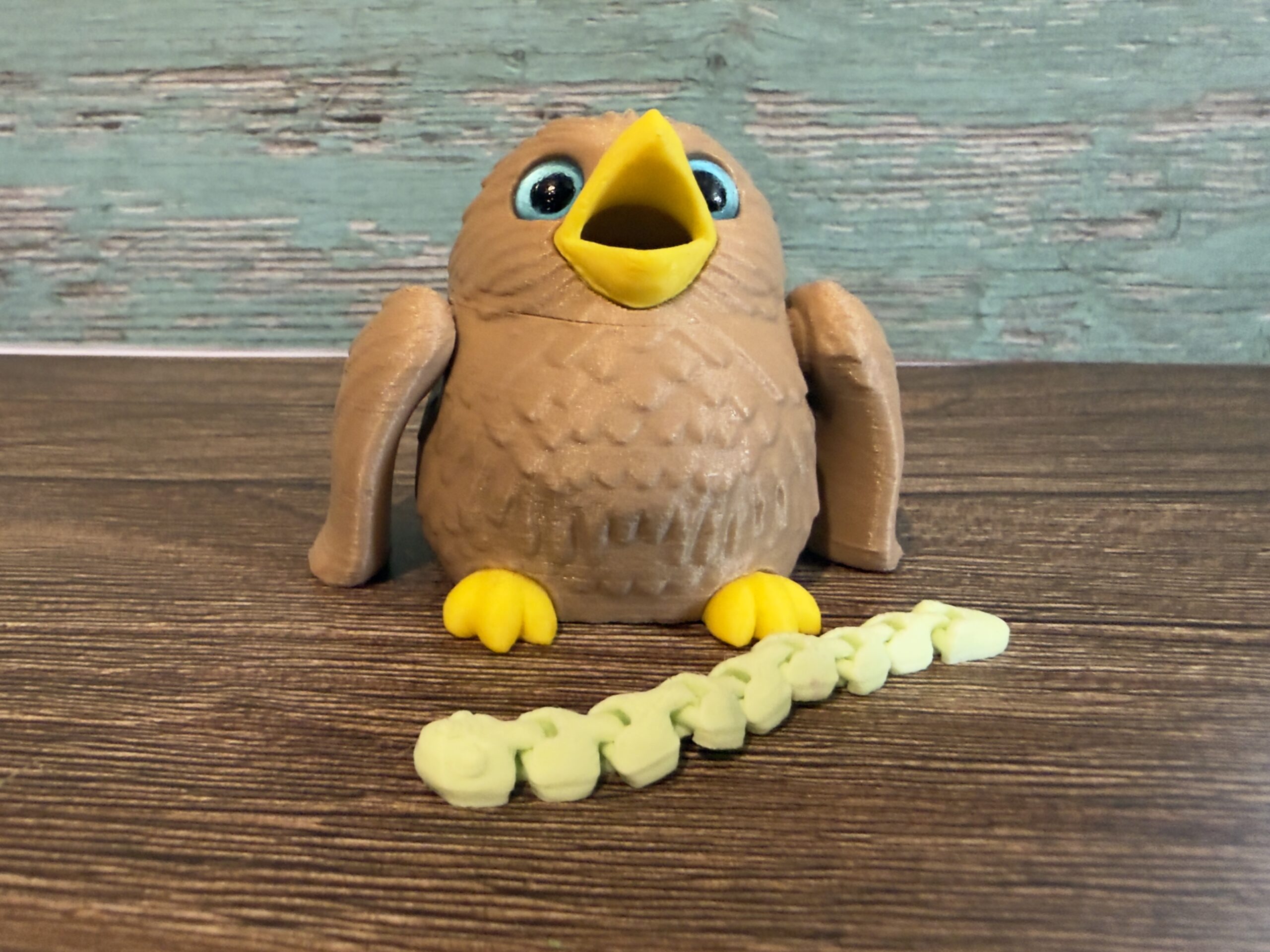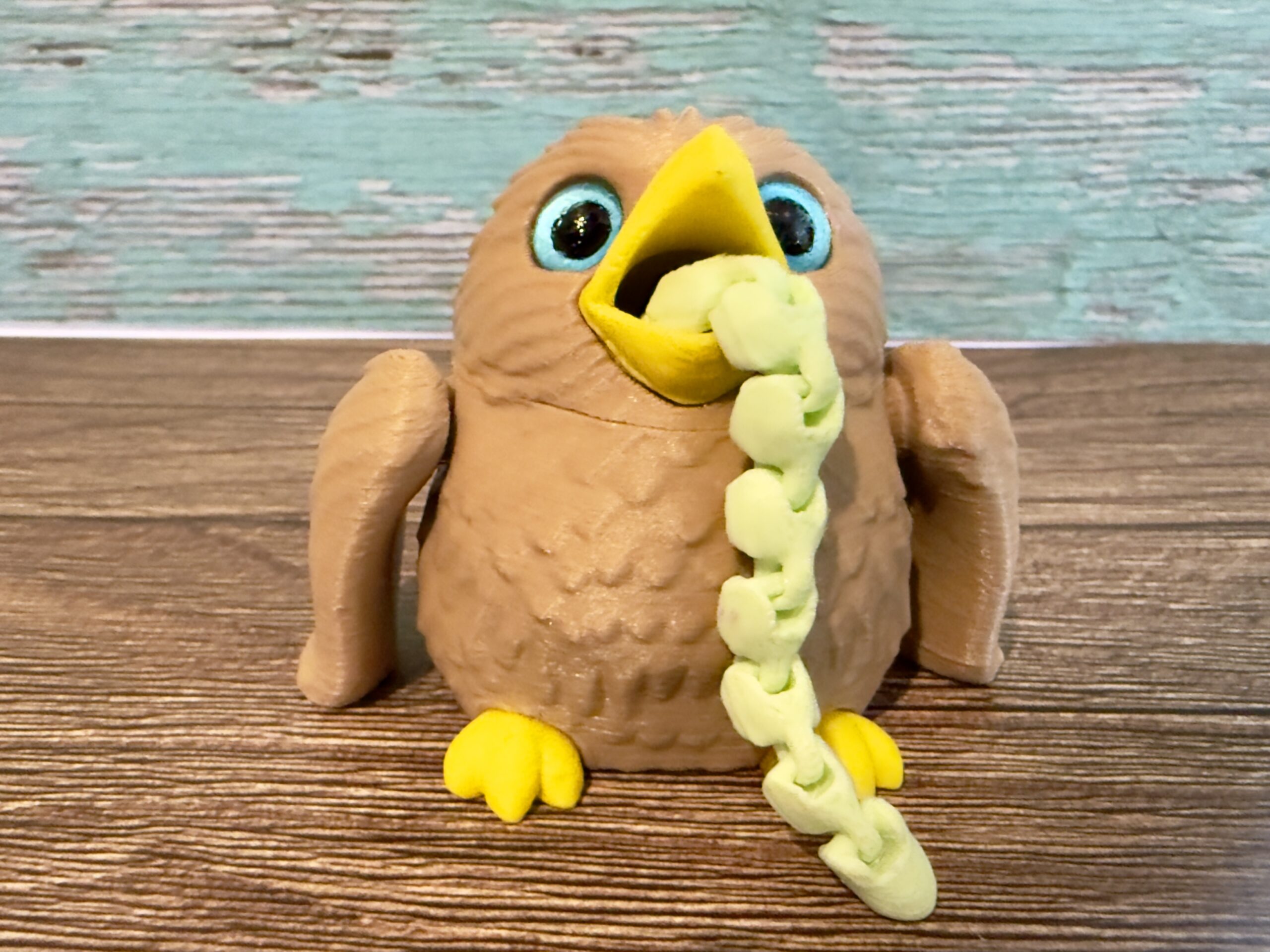With its wide, expressive eyes, cheerful yellow beak, textured feather details, and wonderfully round body, this hungry bird has personality in spades. But here’s the fun part – feed the articulated worm into the bird’s open beak and watch it travel all the way through and emerge from the other end! The fully poseable wings add to the charm, making this both a fidget toy and an endless source of giggles.