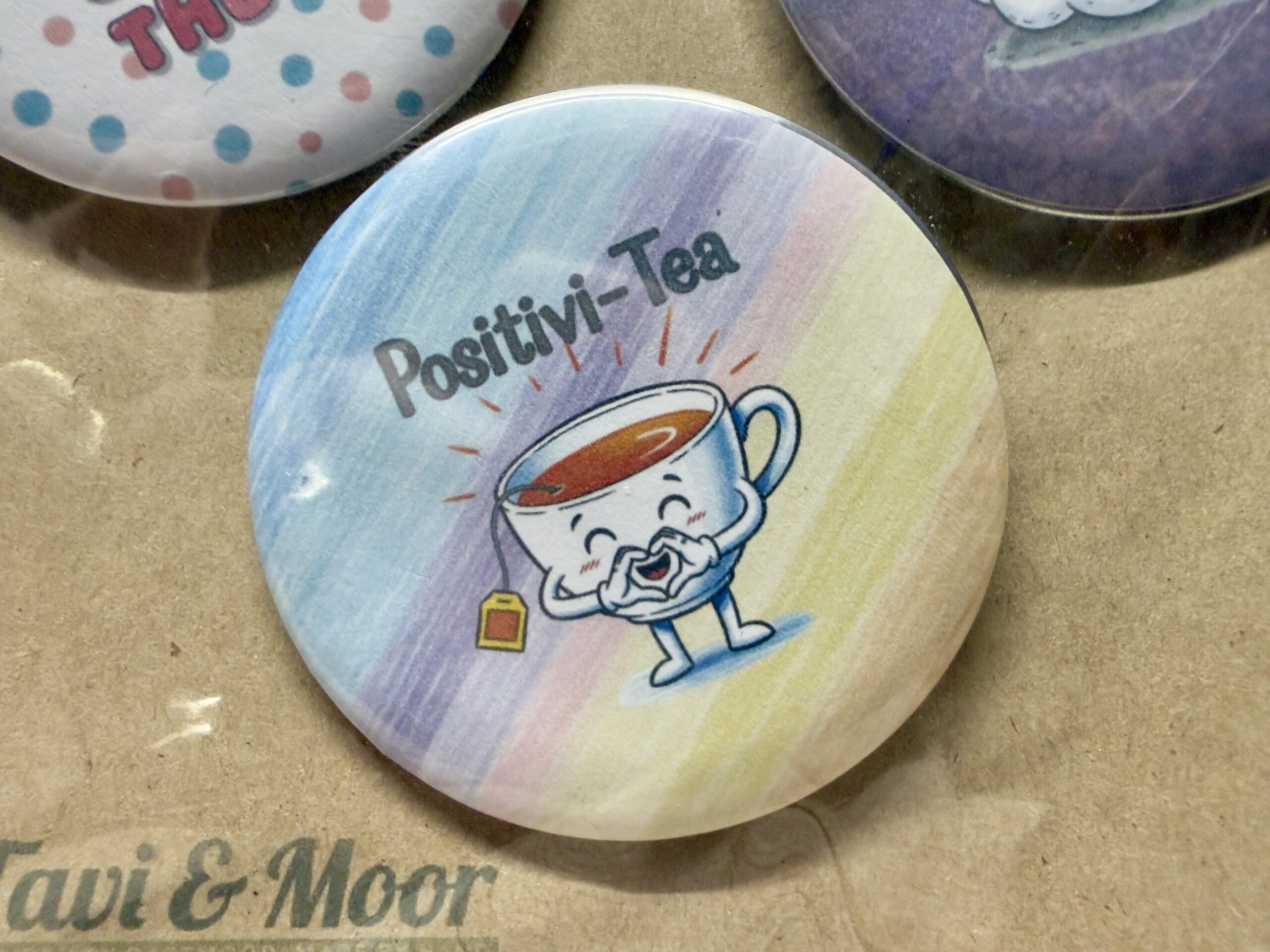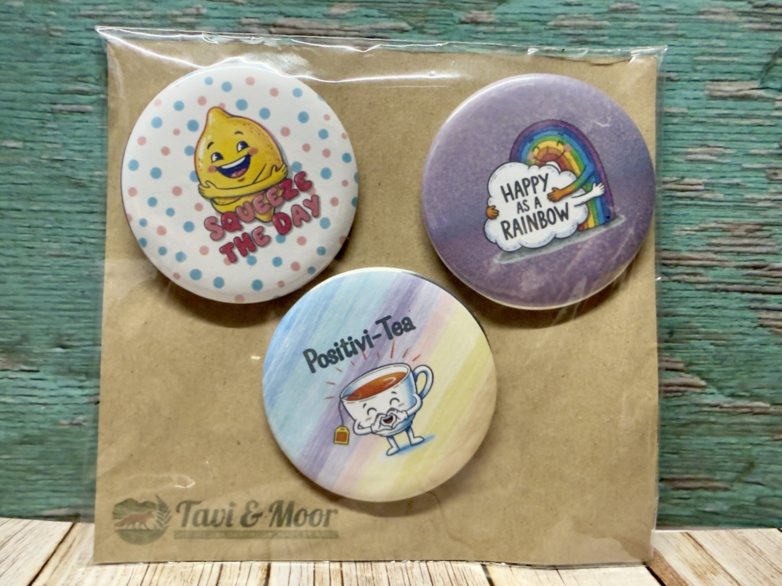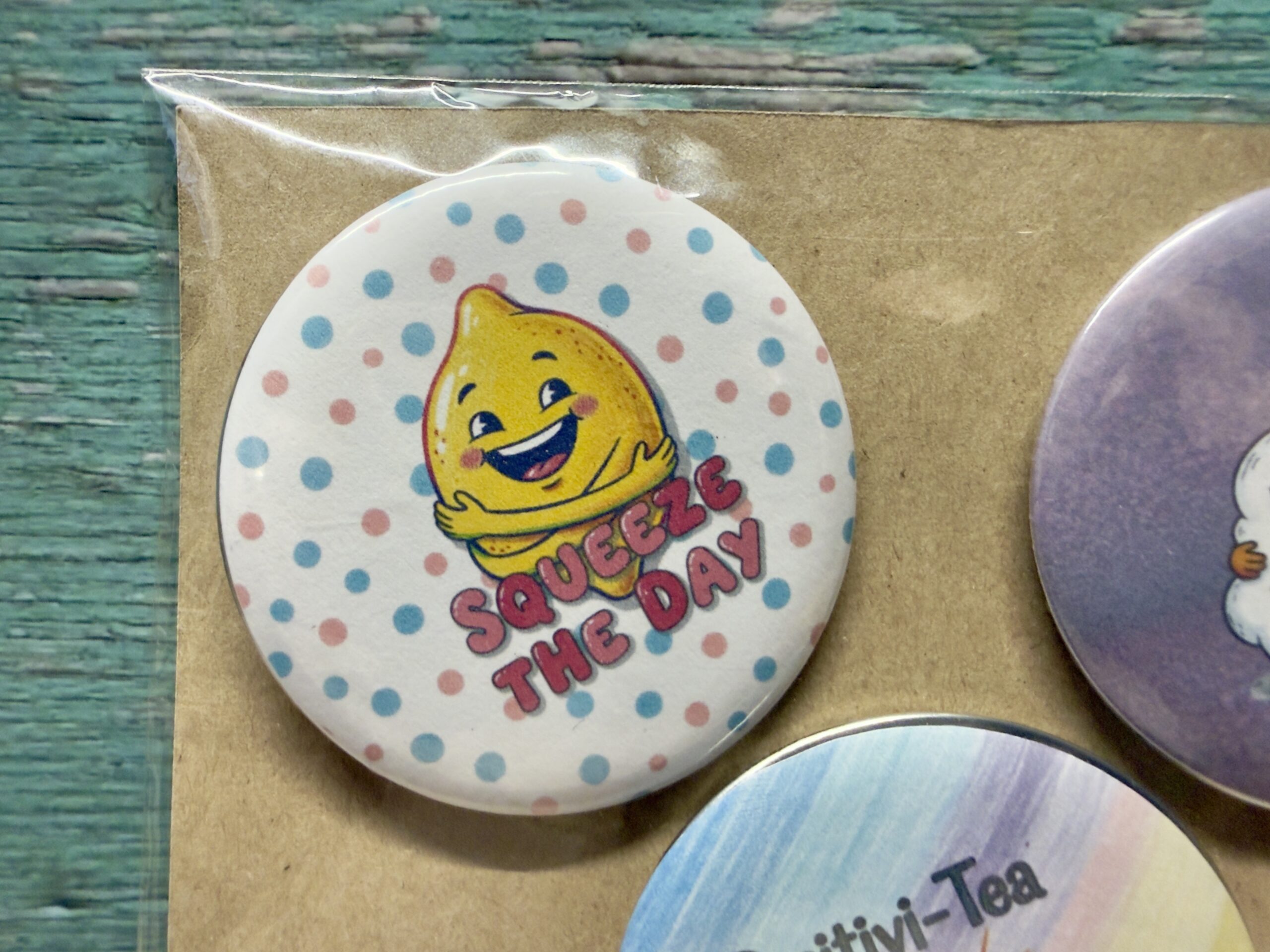 Note: Set includes all three badges shown. Designs feature “Squeeze the Day,” “Happy as a Rainbow,” and “Positivi-Tea.”